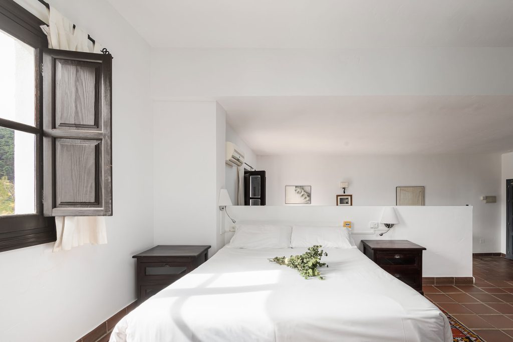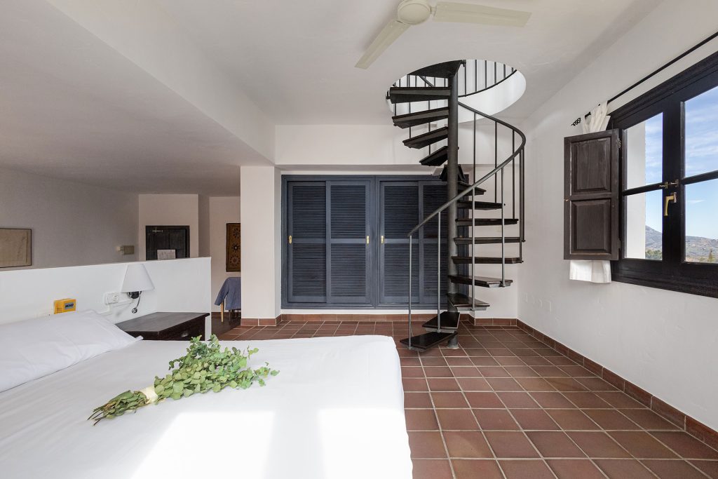 Máxima exclusividad. Es la habitación más espaciosa con 50 m2 dividido en tres niveles. Posee el torreón subiendo la escalera de caracol donde aparte de una preciosa vista panorámica del pueblo encontrará una bañera de hidromasaje.